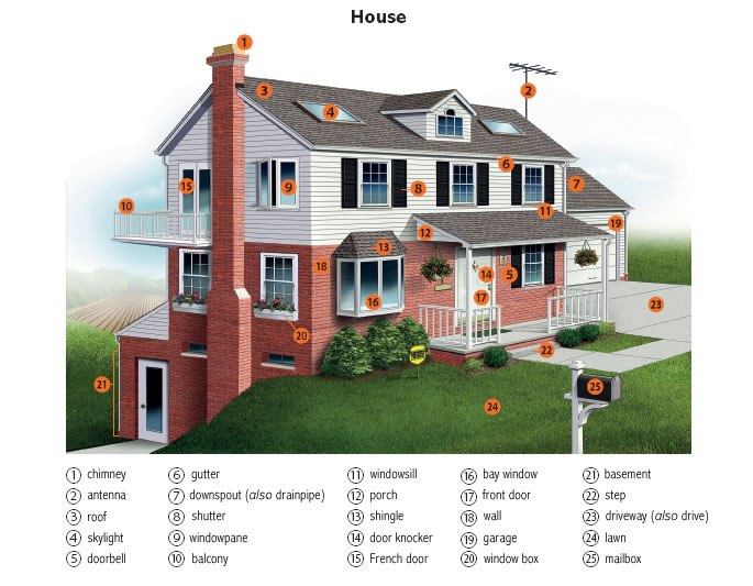['ʧɪmnɪ] дымоход, [æn'tenə] антенна, [ruːf] крыша, ['skaɪlaɪt] окно на крыше, ['dɔːbel] дверной звонок, ['gʌtə] жёлоб, ['daunspaut] ; водосточная труба, ['dreɪnpaɪp] водосточная труба,